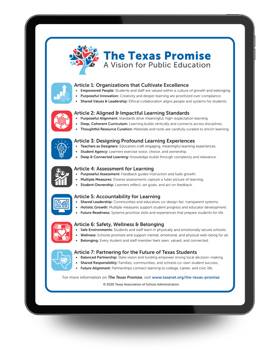 The Texas Promise: A Vision for Public Education reflects a shared commitment to honoring the foundational role of public education while reimagining how schools cultivate excellence, foster belonging, and prepare students for life beyond graduation. This vision is not prescriptive—it is aspirational, offering guidance for continuous growth grounded in trust, professionalism, and local leadership.